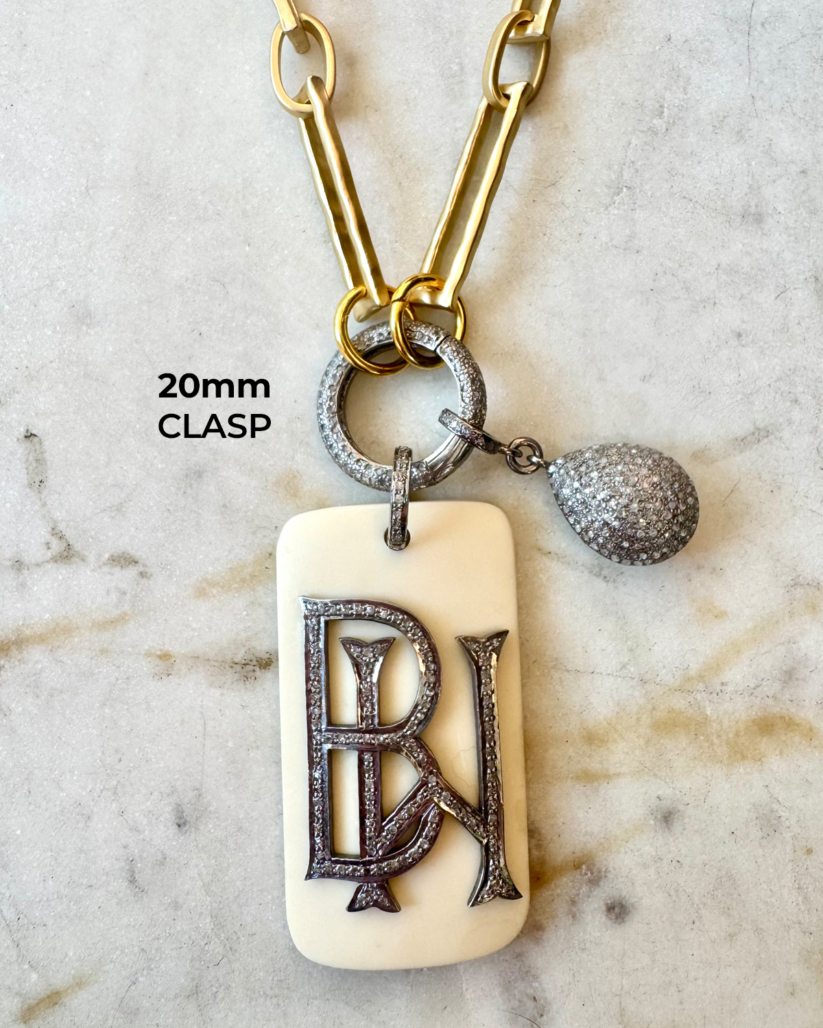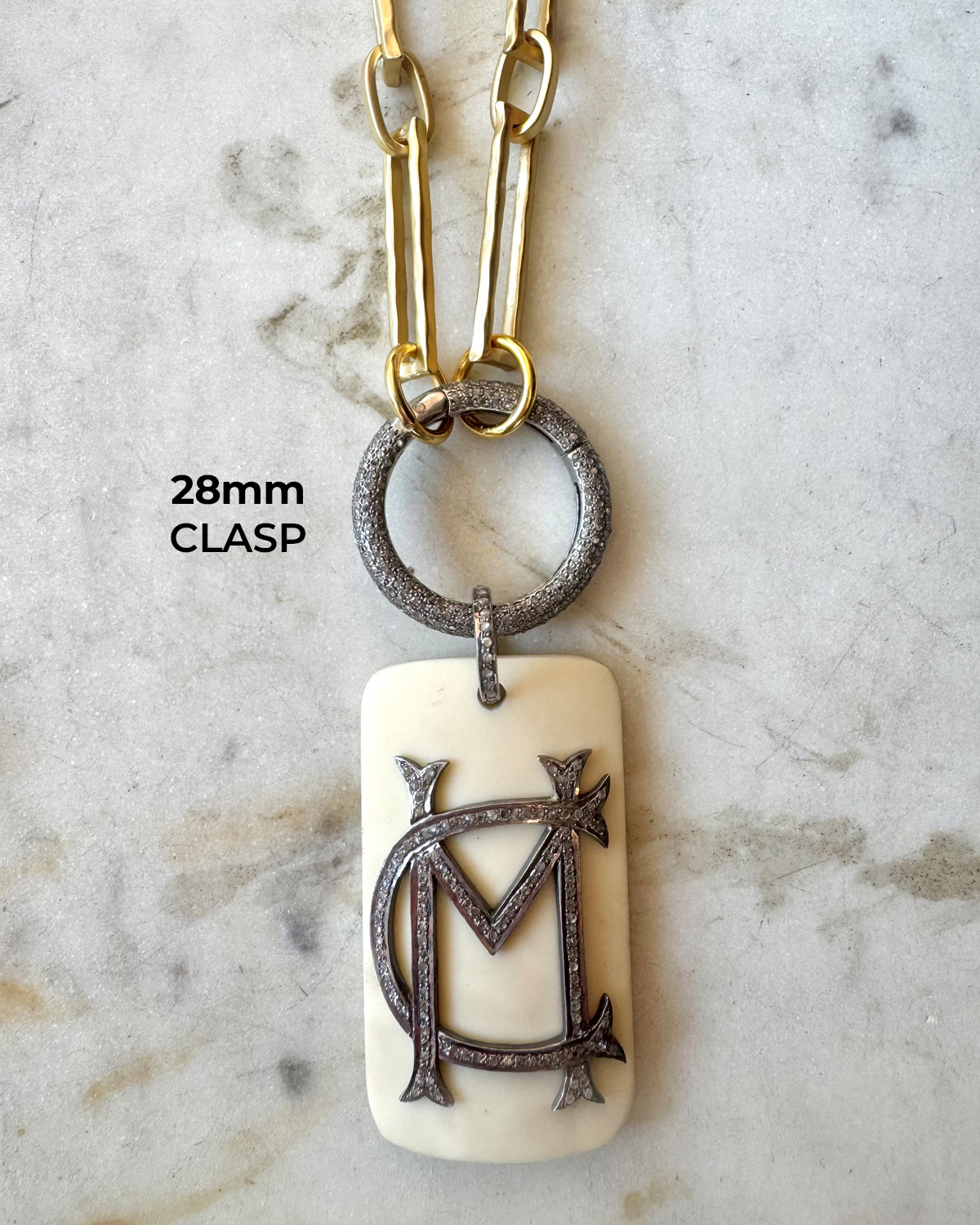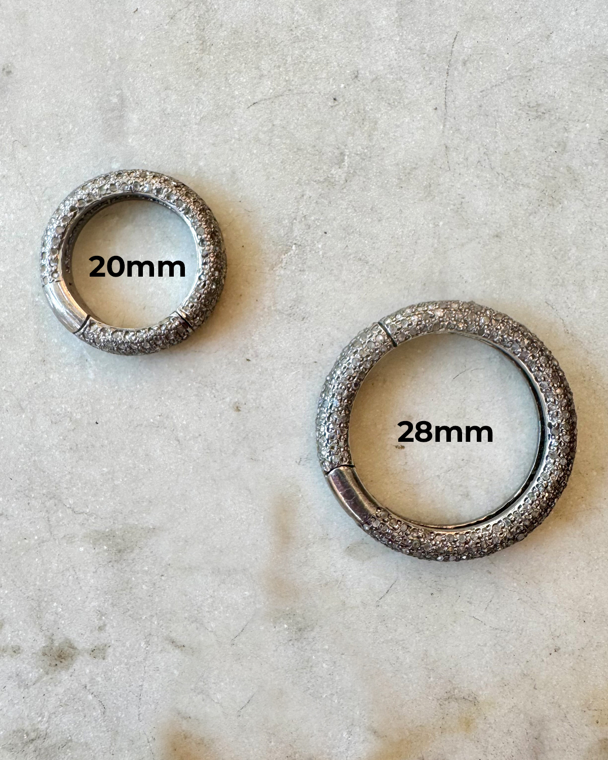 The circle clasp alone (no chain) is available in two sizes – 20mm and 28mm. It is a sterling base with handset diamonds and the circle opens and closes by pulling out.