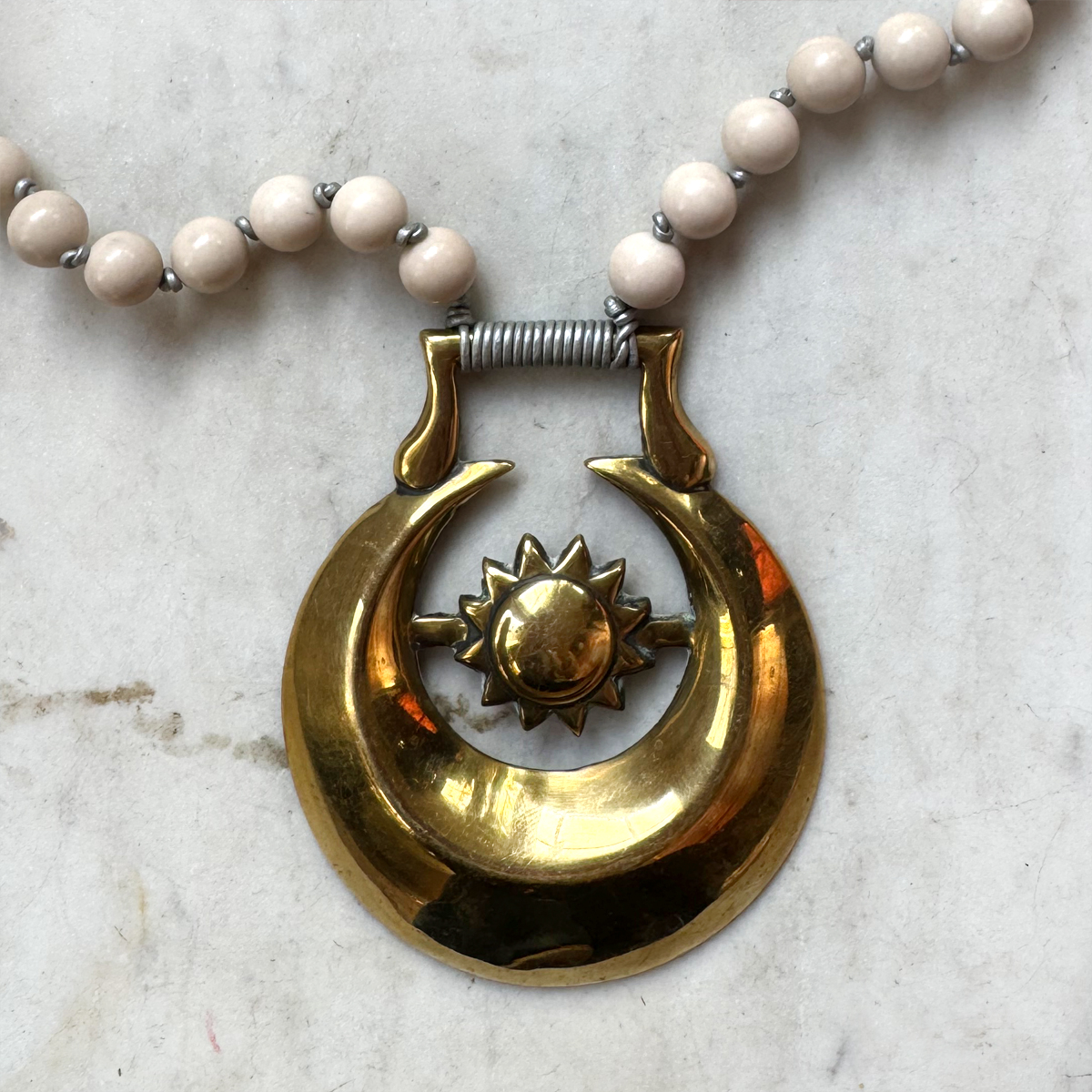 Off white Jasper beads with silver colored leather cord. A 1930’s era horse brass with a crescent shape and center sun graces the end of the piece.